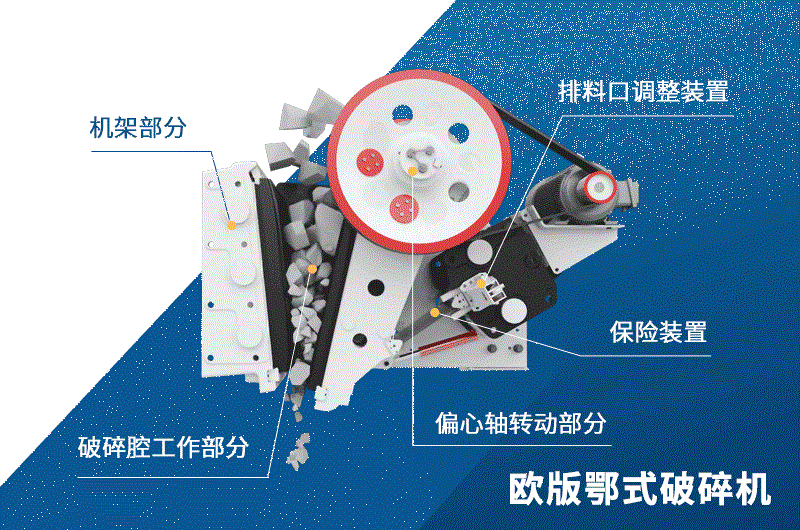 顎式破碎機(jī)主要由機(jī)架、工作機(jī)構(gòu)、傳動(dòng)機(jī)構(gòu)、調(diào)節(jié)裝置、拉緊裝置,保險(xiǎn)裝置和潤滑系統(tǒng)組成: